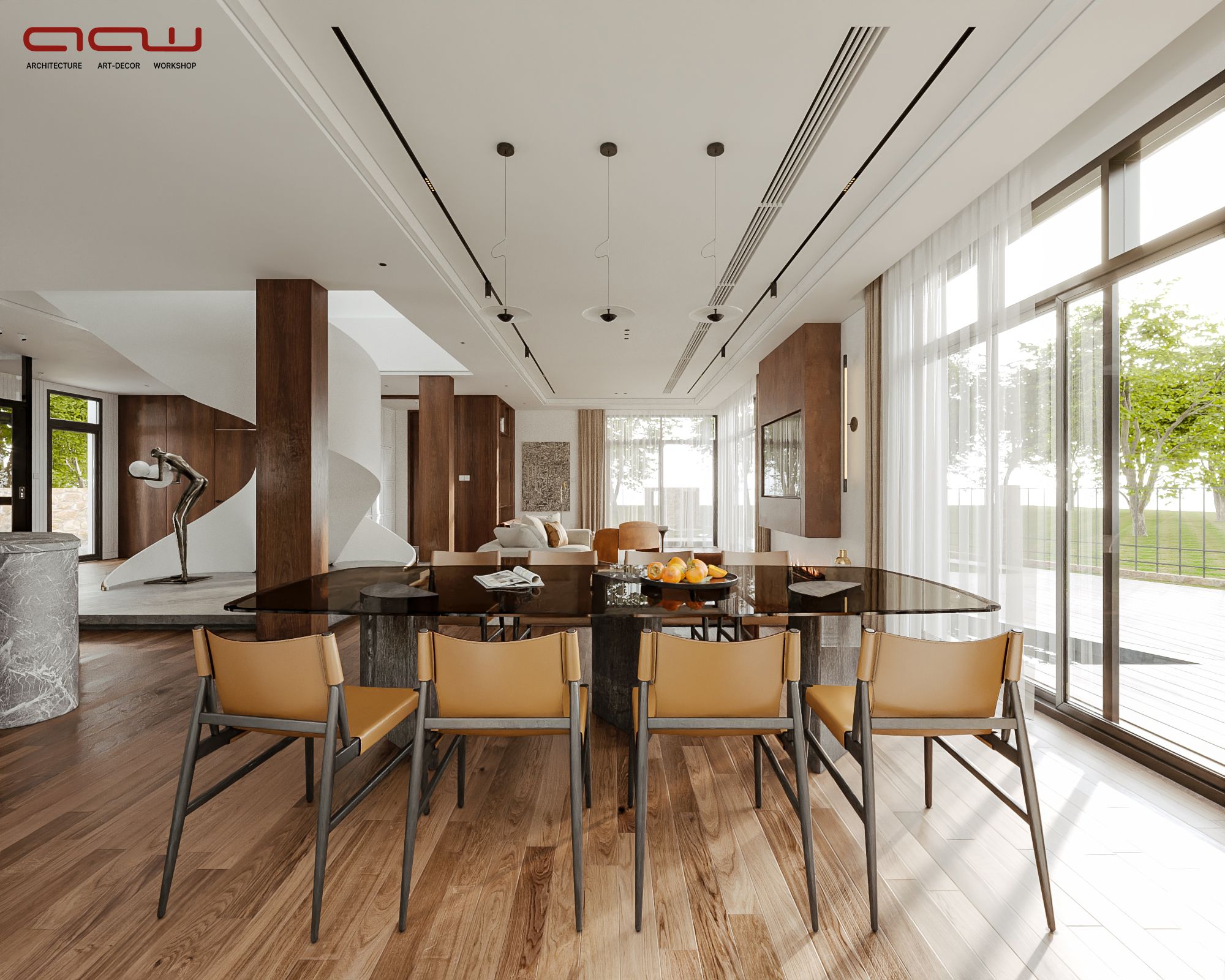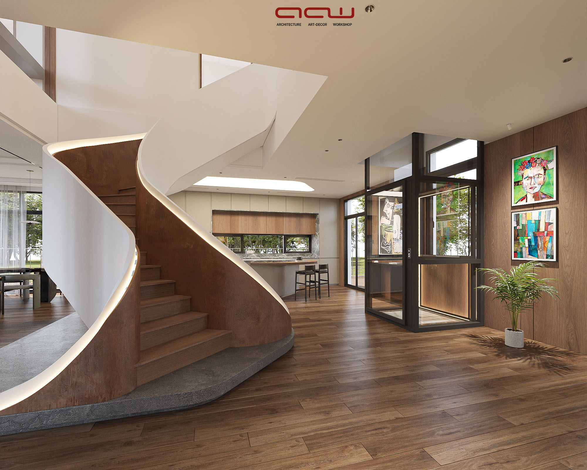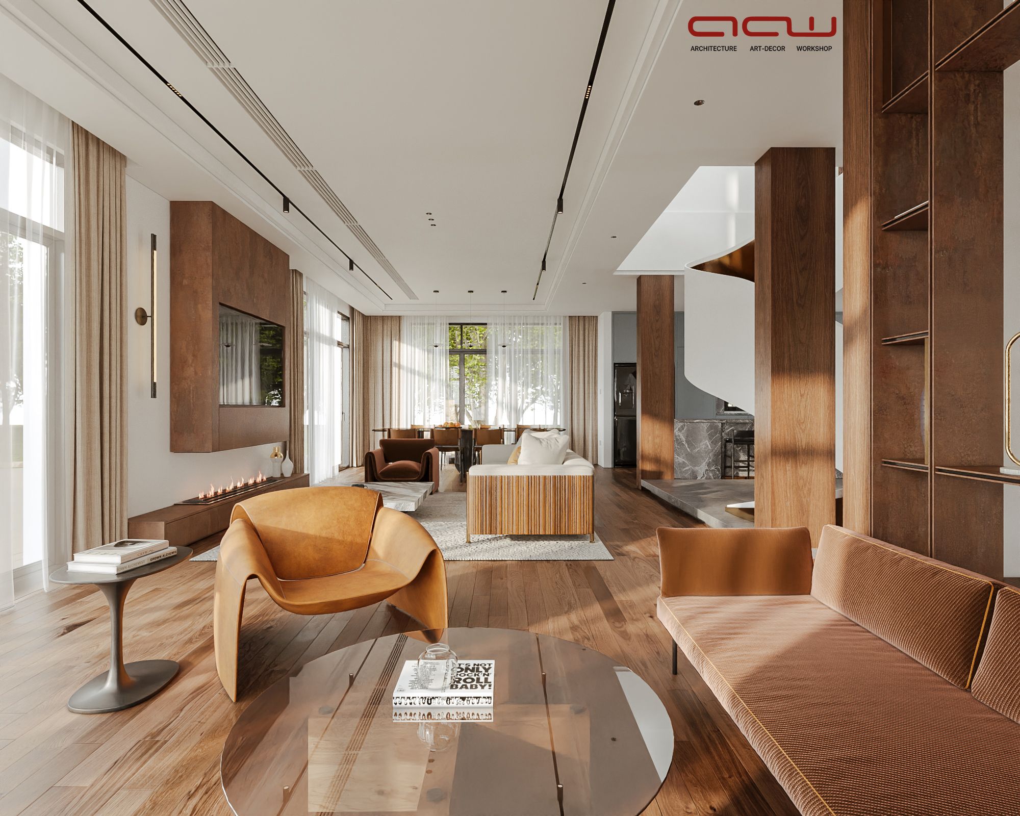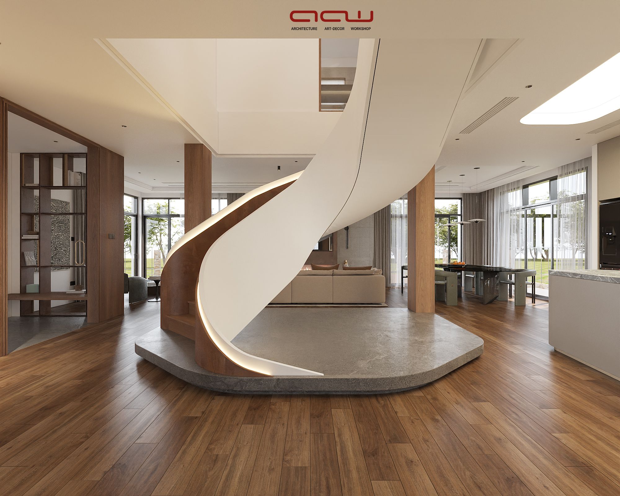 Ngôn ngữ thiết kế tập trung vào đường nét tinh giản, hình khối rõ ràng, kết hợp vật liệu gỗ, đá và bề mặt trung tính để tạo chiều sâu thị giác. Điểm nhấn đáng chú ý là cầu thang cong mềm mại đóng vai trò như một yếu tố điêu khắc trung tâm, giúp kết nối các tầng không gian một cách liên tục và giàu cảm xúc. Ánh sáng tự nhiên được khai thác thông qua các khoảng mở, cửa kính lớn và giếng trời, góp phần cải thiện vi khí hậu trong điều kiện đô thị.