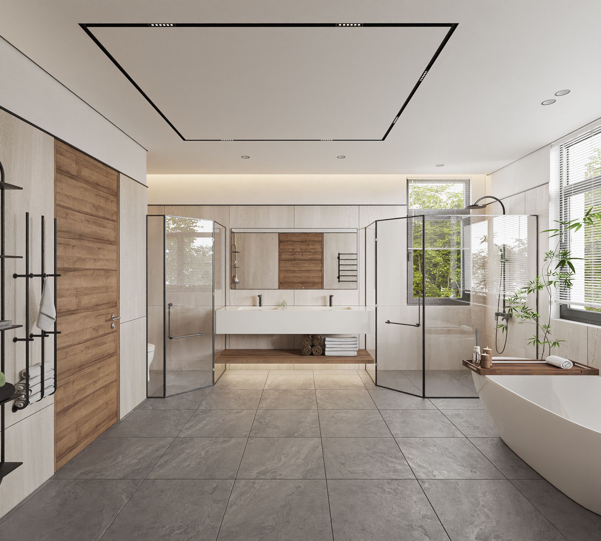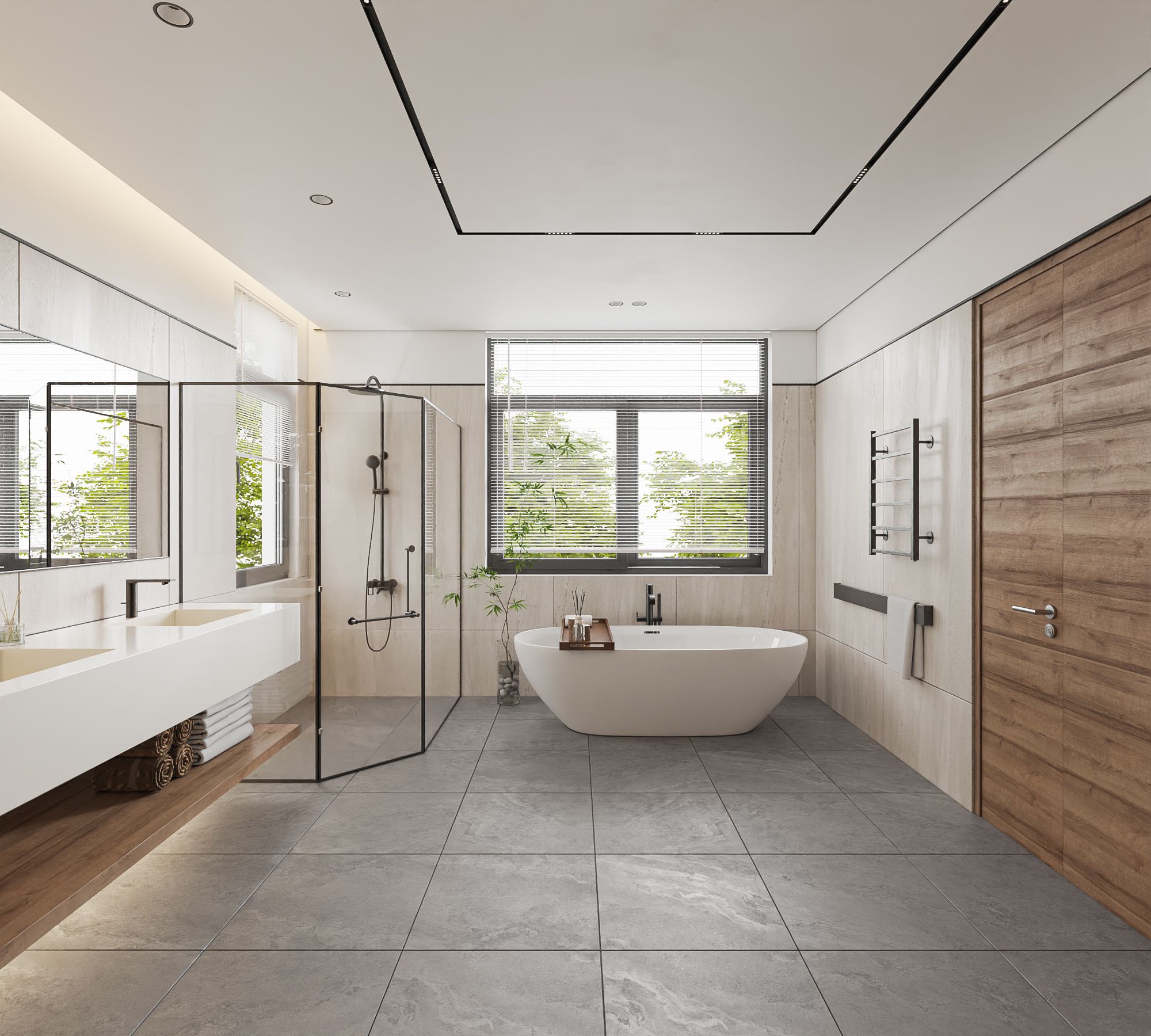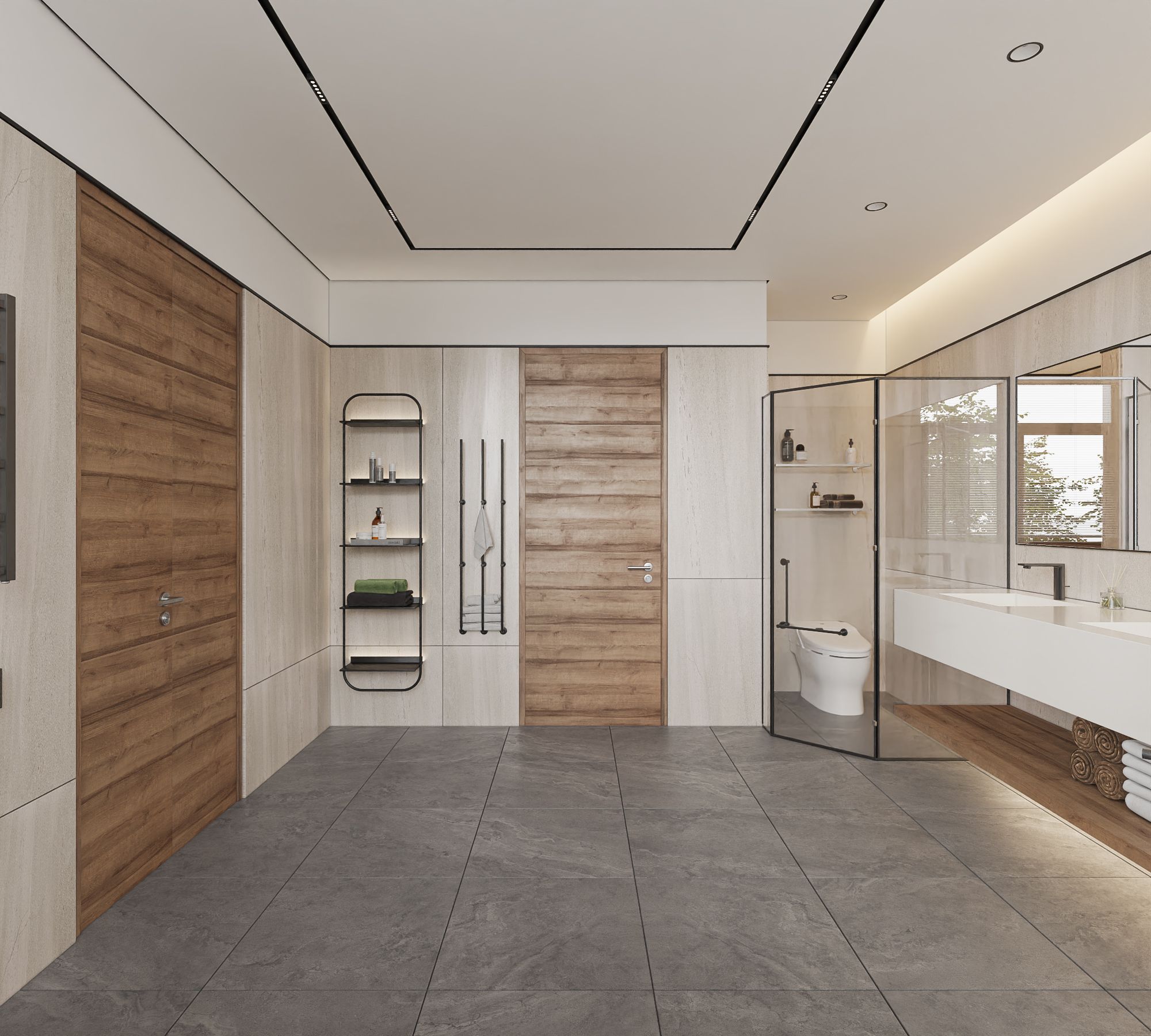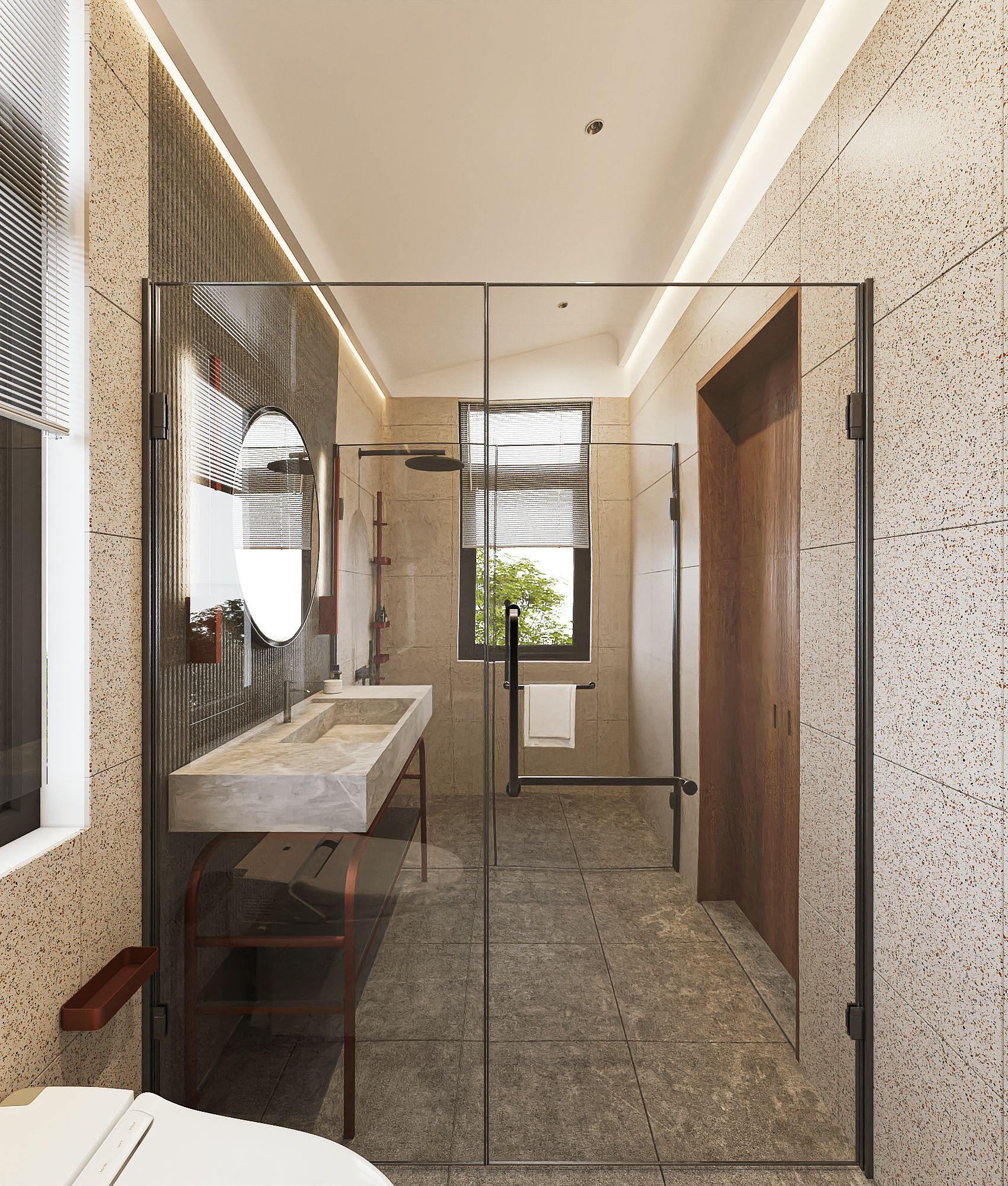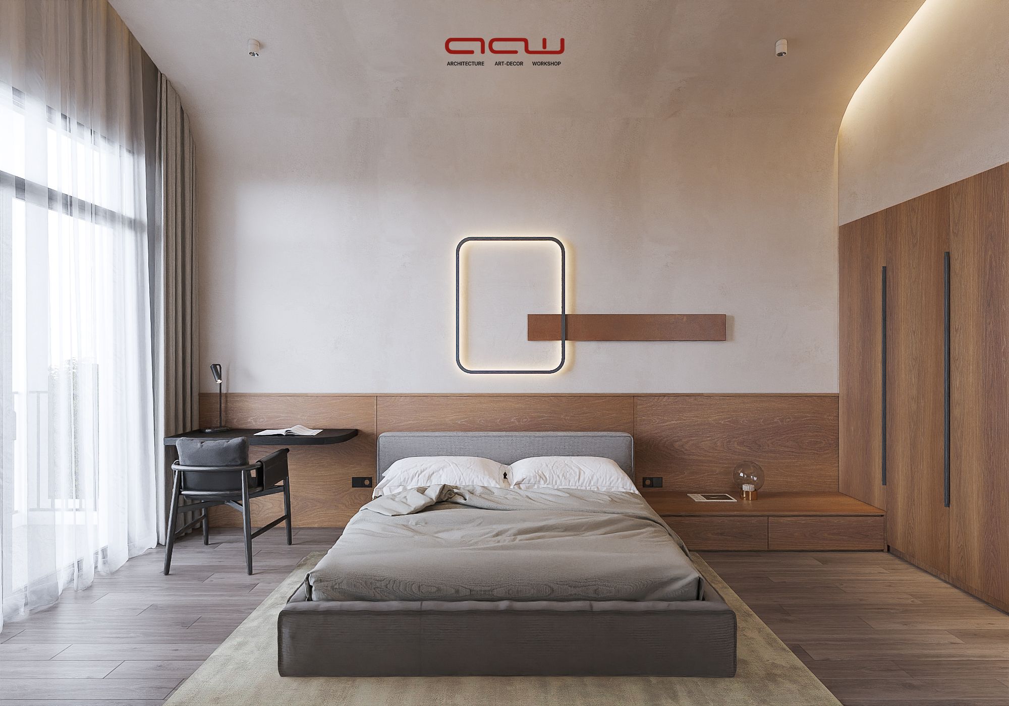 Ngôn ngữ thiết kế tập trung vào đường nét tinh giản, hình khối rõ ràng, kết hợp vật liệu gỗ, đá và bề mặt trung tính để tạo chiều sâu thị giác. Điểm nhấn đáng chú ý là cầu thang cong mềm mại đóng vai trò như một yếu tố điêu khắc trung tâm, giúp kết nối các tầng không gian một cách liên tục và giàu cảm xúc. Ánh sáng tự nhiên được khai thác thông qua các khoảng mở, cửa kính lớn và giếng trời, góp phần cải thiện vi khí hậu trong điều kiện đô thị.