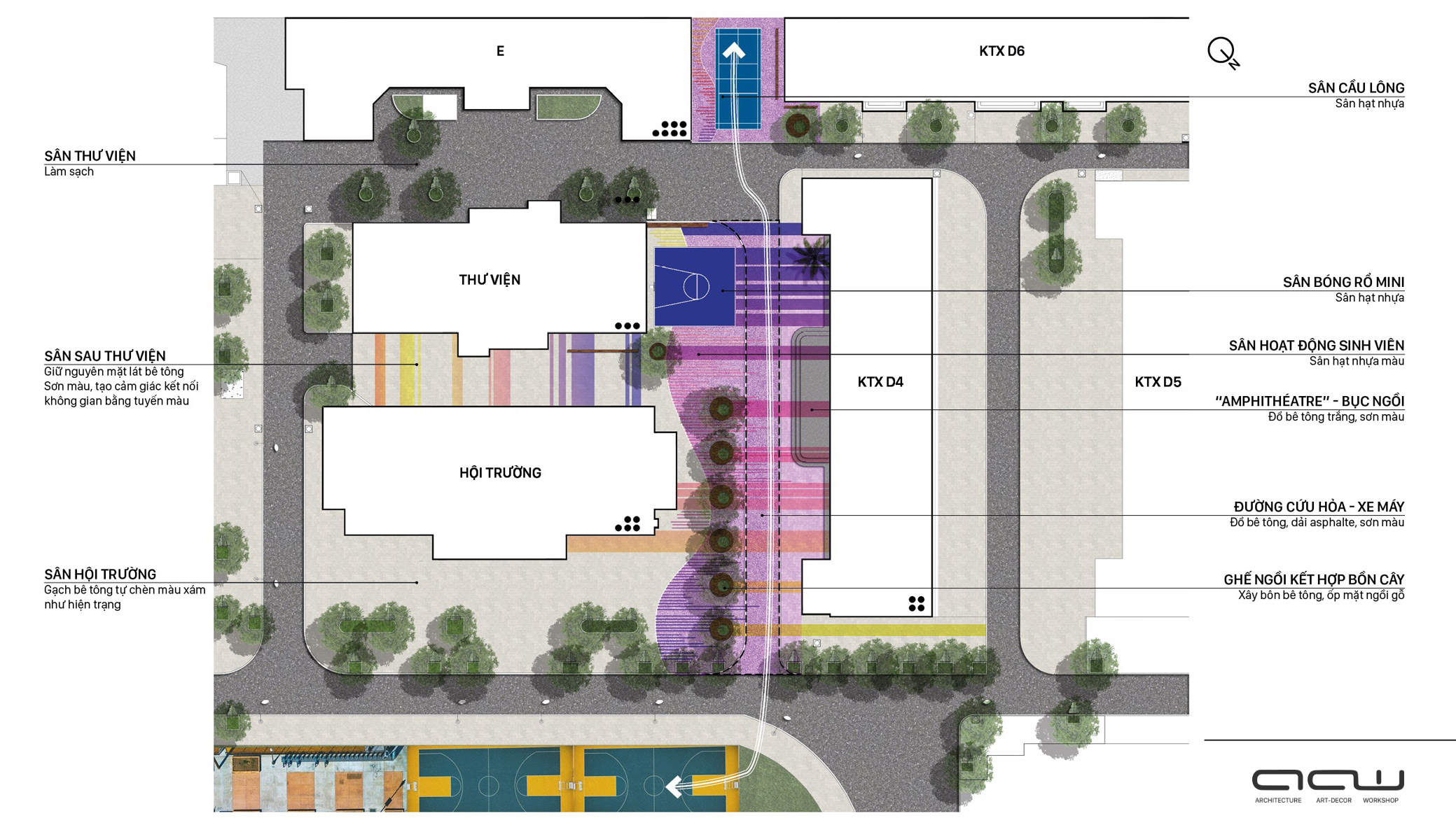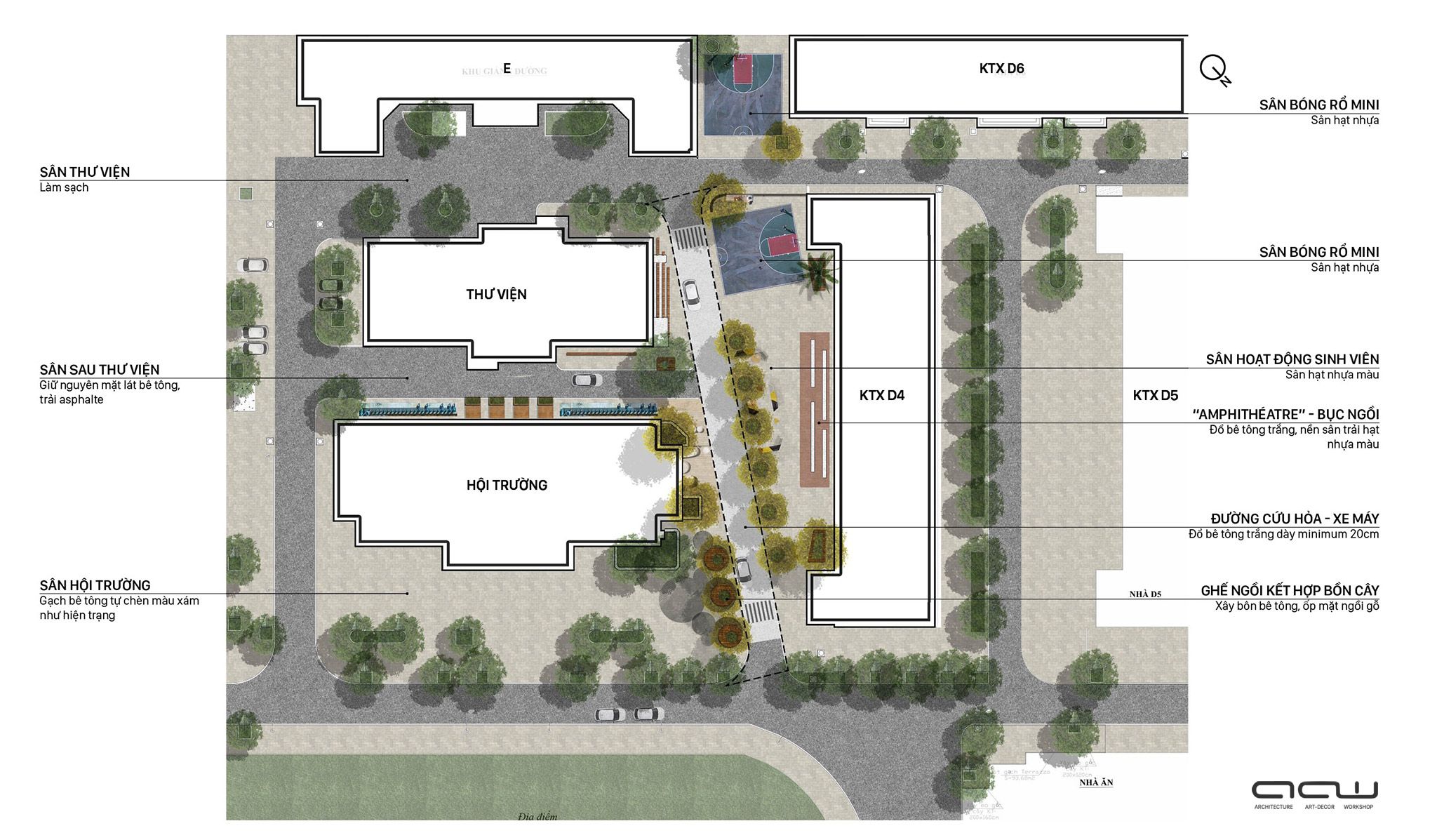 Với mong muốn có một không gian chung kết nối và hấp dẫn dành cho sinh viên tại trường Đại học Hà Nội, sân chung campus của HANU đã được đội ngũ AAW thiết kế cải tạo lại và khoác lên mình một dáng vẻ mới thuận tiện di chuyển hơn, các hoạt động đa dạng và phù hợp hơn đối với từng câu lạc bộ, từng sinh viên của trường như nơi để nghỉ ngơi sau những tiết học, để thư giãn với bạn bè, tổ chức các sự kiện phong trào, các hoạt động vui chơi giải trí, thi đấu thể dục thể thao...