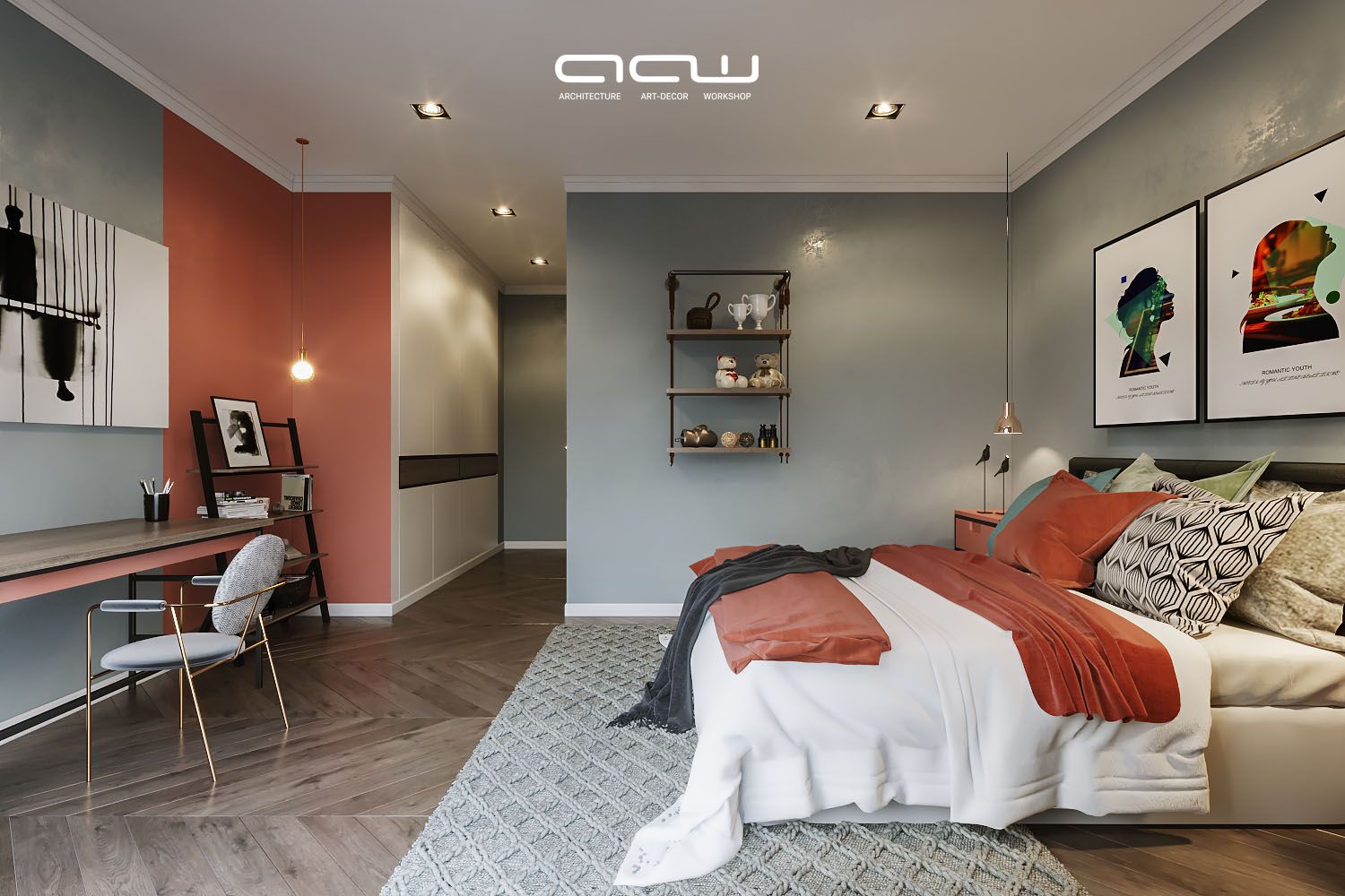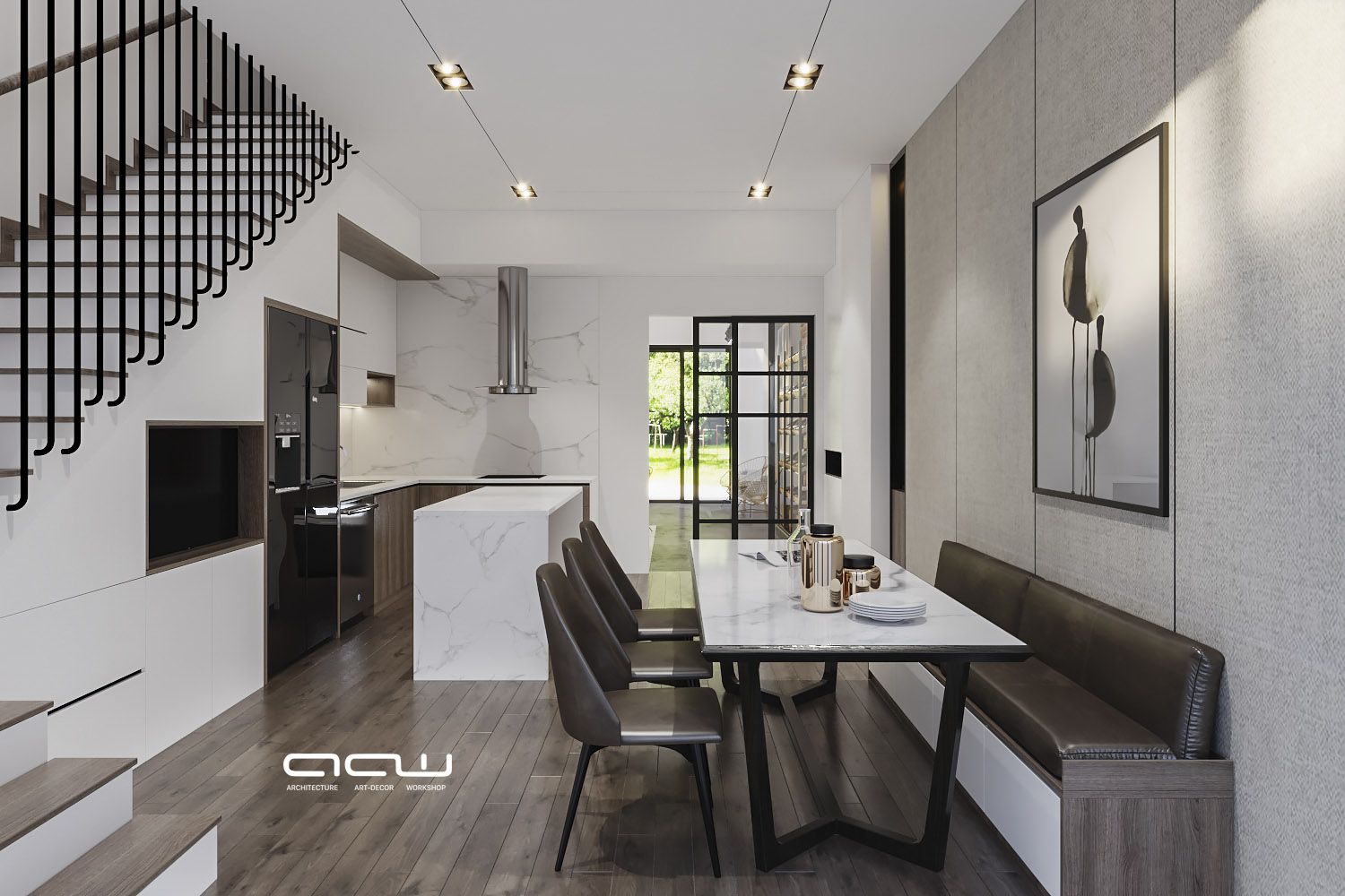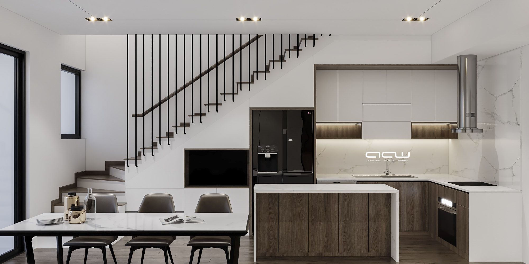 Căn shop house vỏn vẹn 100m2/tầng được ê-kíp AWW tô điểm đầy sáng tạo. Giữ nguyên hình khối kiến trúc mặt đứng & chỉ thay đổi không gianm kết cấu bên trong căn nhà, AAW đưa ra những giải pháp về công năng sử dụng & những bức tranh lột tả mỗi cá nhân trong gia đình. Ba thế hệ cùng sinh sống nhưng ai cũng có không gian riêng để thỏa cái “cá nhân” của mình. Màu sắc, phong cách gắn liền với từng chủ thể sở hữu không gian đó. Và rồi họ quây quần lại trong không gian chung (bếp, khách) mang tính trung hòa hơn để chia sẻ cùng nhau những câu chuyện, những góc nhìn sau một ngày làm việc, học tập