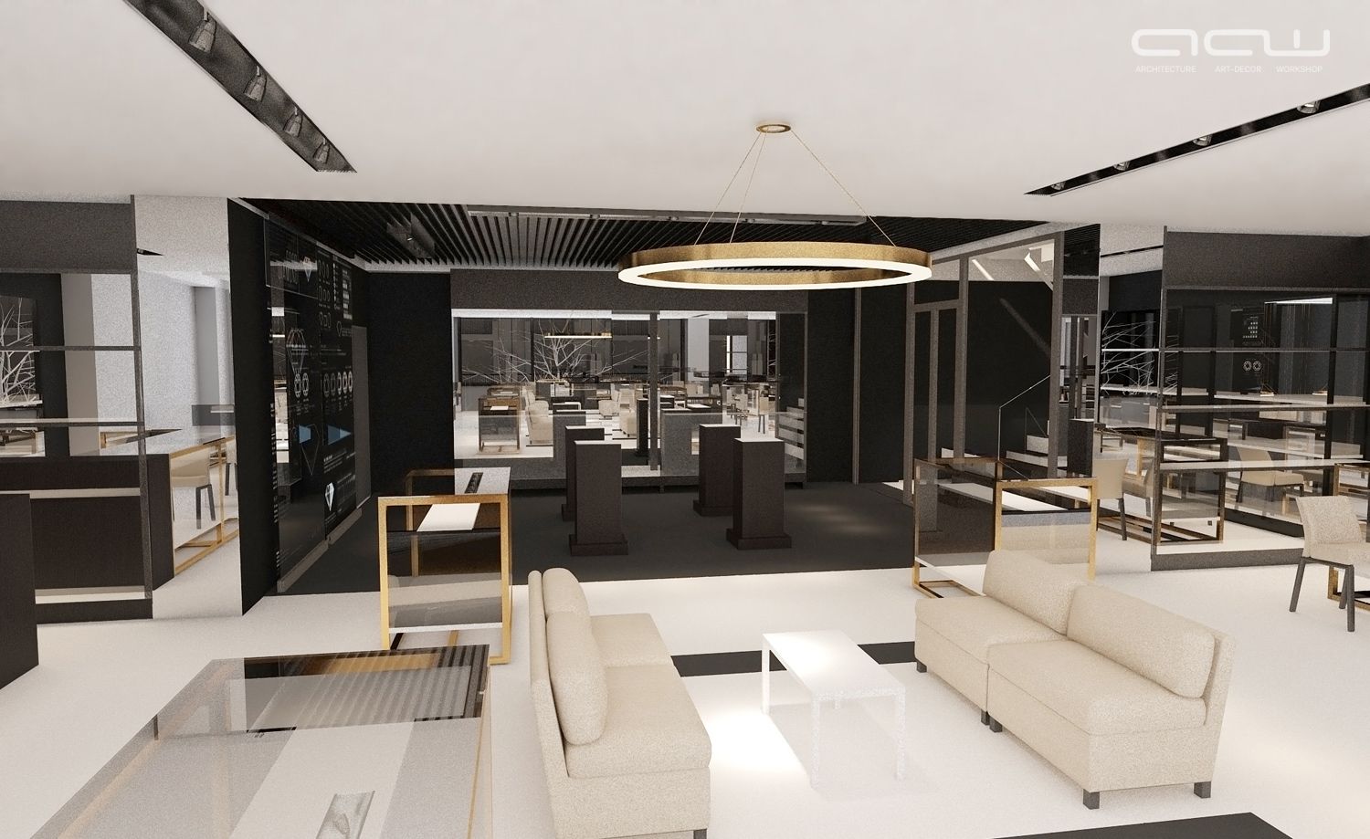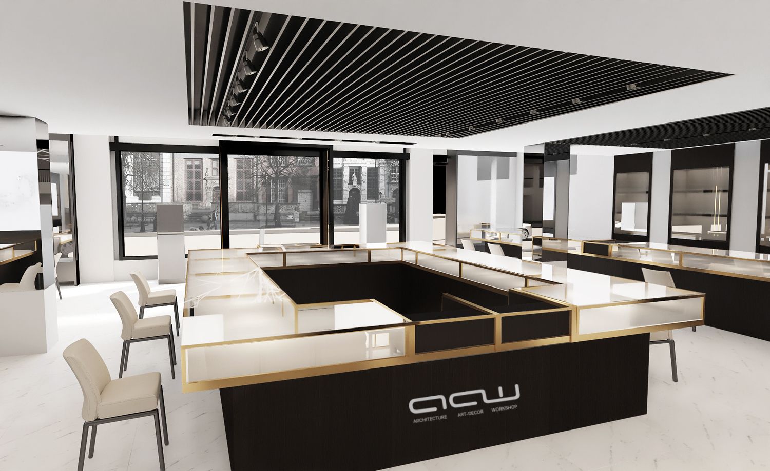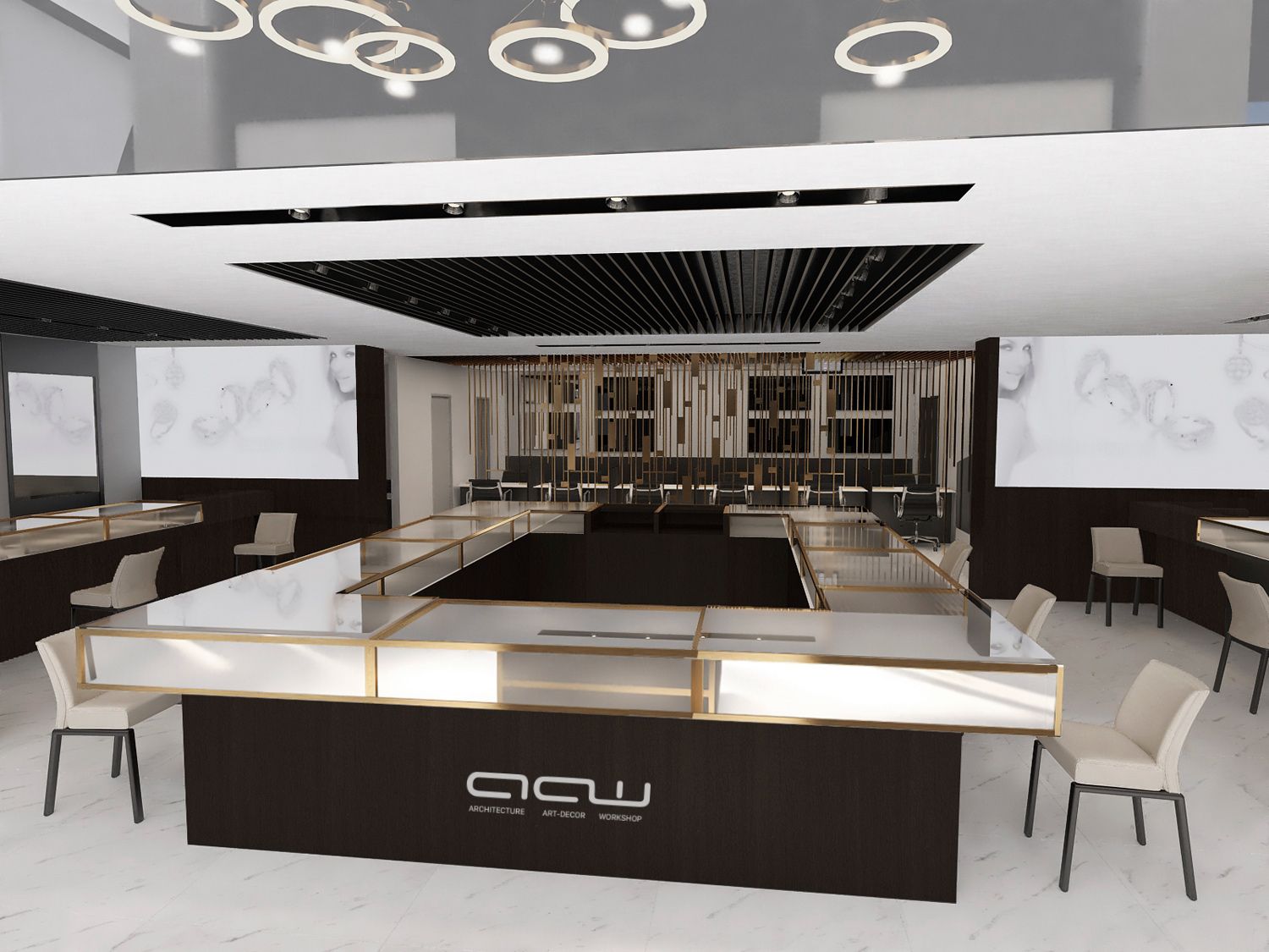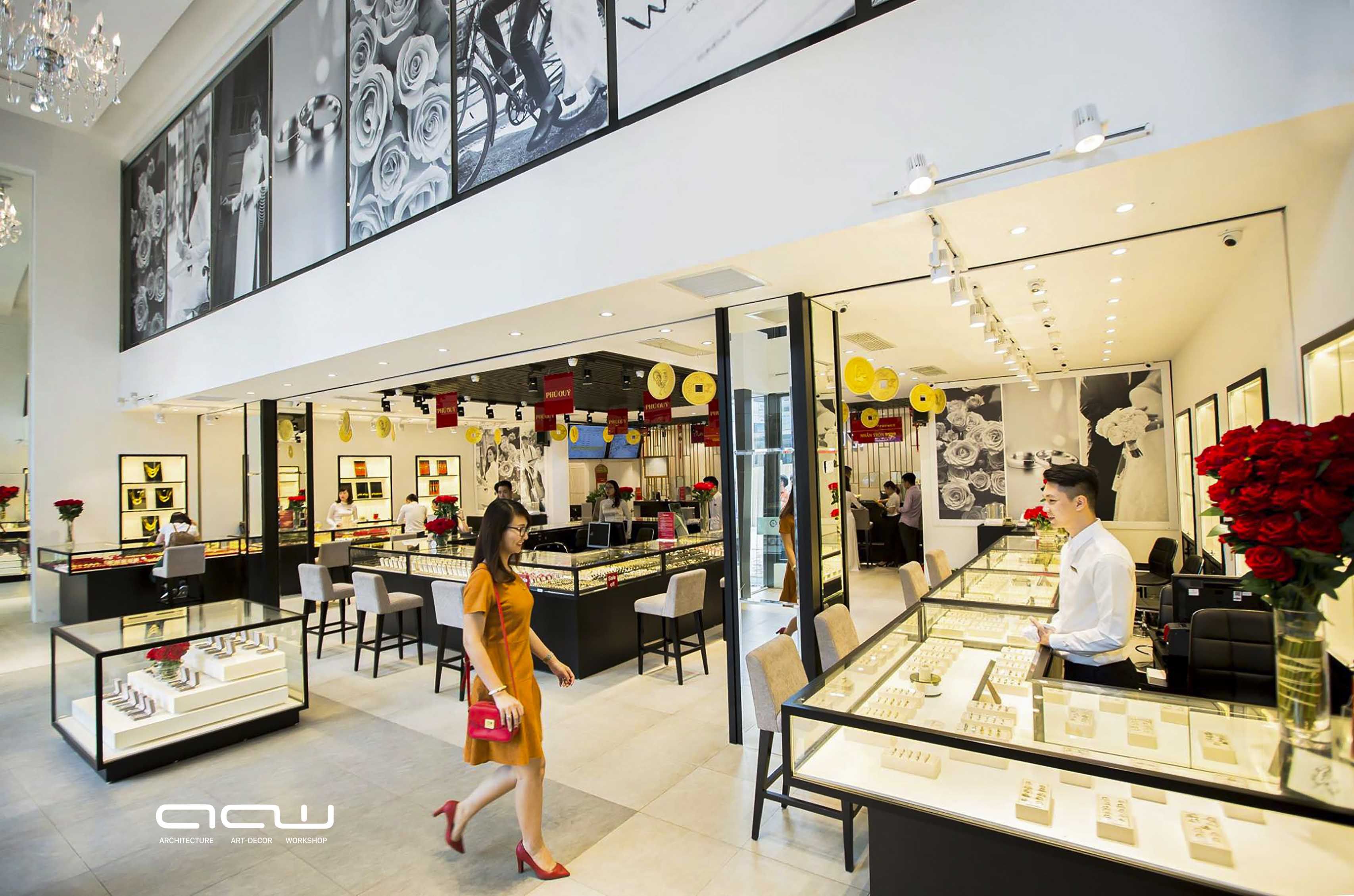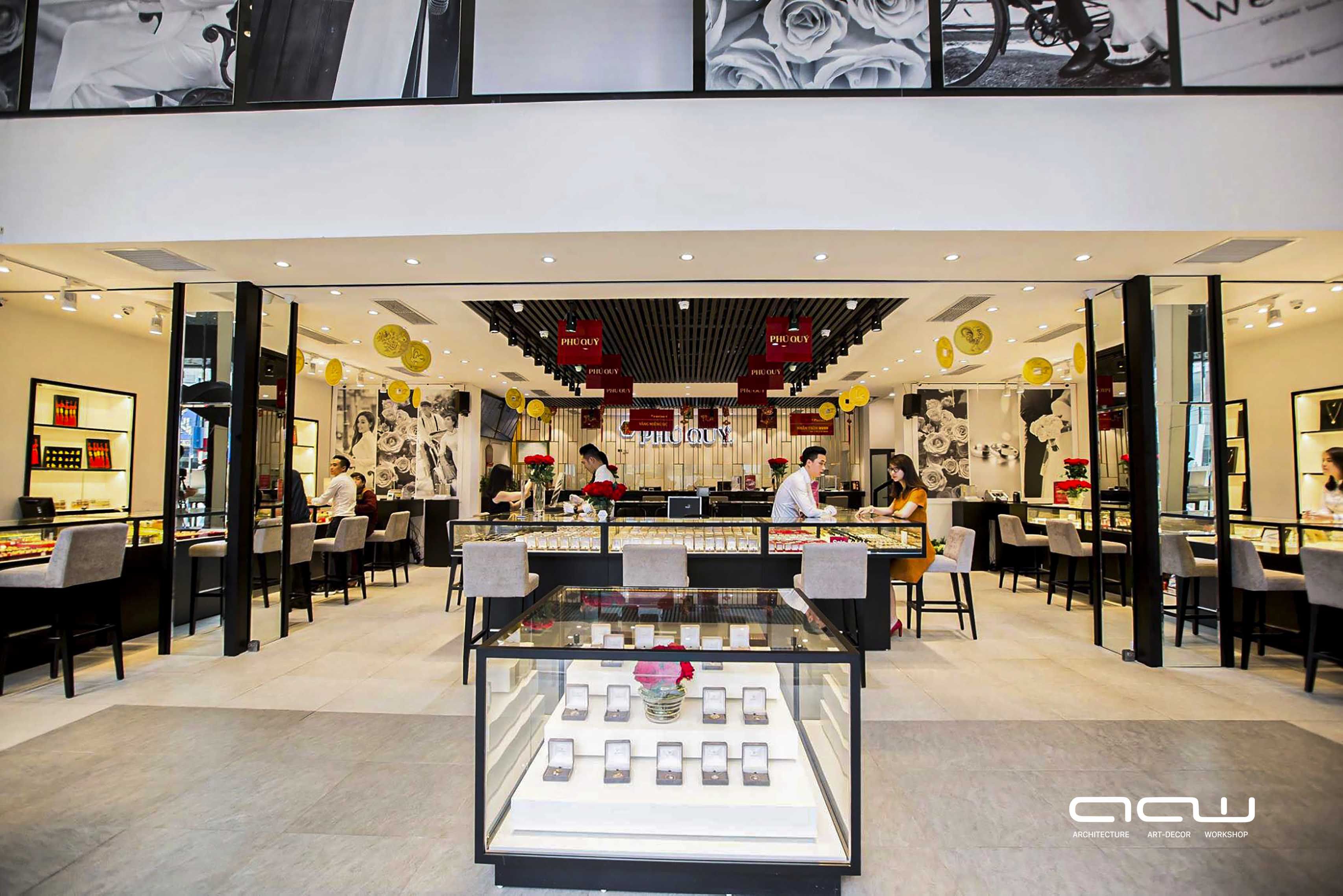 Đến với Phú Quý Jewelry Cầu Giấy, dưới bàn tay của đội ngũ ekip AAW, bạn sẽ thấy một showroom mang phong cách đơn giản, nhã nhặn nhưng hiện đại với hai tone màu đối lập chủ đạo là đen và trắng, đồng thời cũng được cân bằng bởi một màu vàng gold. Hệ thông cửa kính không chỉ tận dụng được ánh sáng tự nhiên của ban ngày mà còn tạo được sự kín đáo riêng tư vừa phải giữa trong ngoài và các quầy, đem lại cảm giác tiện nghi và thoải mái đối với khách hàng.